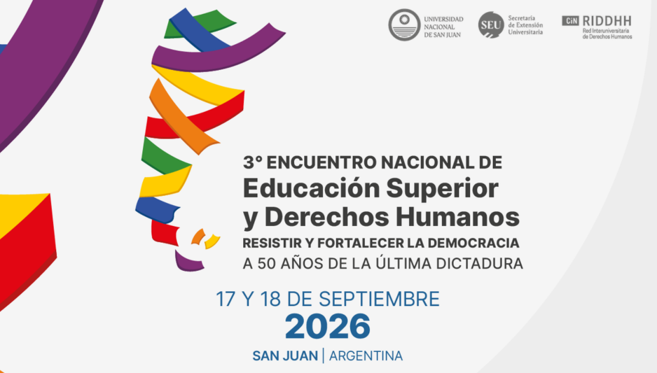 La Red Interuniversitaria de Derechos Humanos del Consejo Interuniversitario Nacional (RIDDHH-CIN), junto a la Universidad Nacional de San Juan (UNSJ), realizará el III Encuentro Nacional de Educación Superior y Derechos Humanos, los días 17 y 18 de septiembre de 2026, en el Complejo Universitario Islas Malvinas de la ciudad de San Juan.